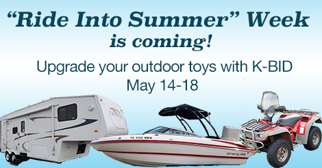 You’re invited to participate in K-BID’s first ever spring auction event – a Spring Toys extravaganza scheduled for the week of May 14th thru May 18th. K-BID intends to actively begin promoting this event on April 17th by soliciting potential sellers for consignments of ATV’s, Campers, UTV’s, Golf Carts, Boats, Motorcycles and other motorized ‘Toys’. K-BID will promote this event heavily from mid-April until the last Spring Toy Auction closes on May 18th.