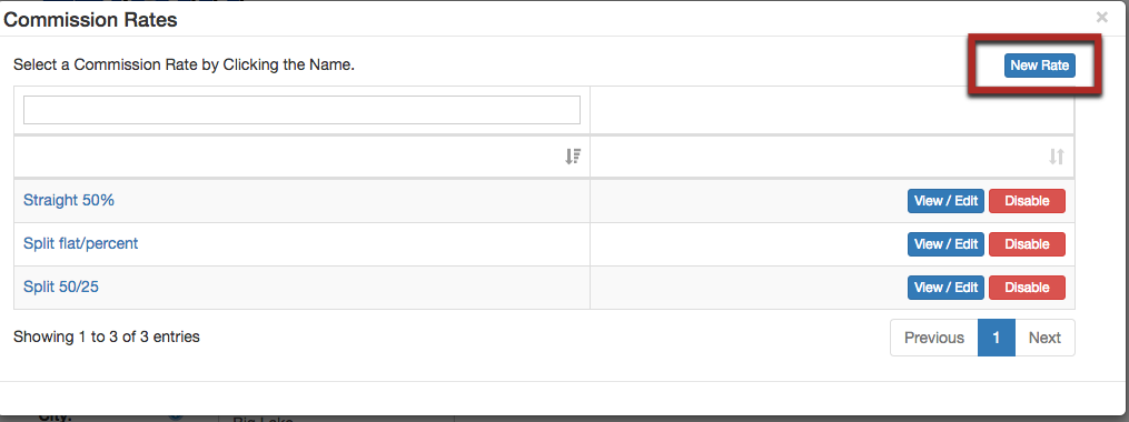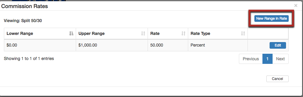 - To add a new tier to a rate, click View/Edit next to the rate and then click New Range in Rate. The bottom of the range will automatically be set to the top of the previous range + 1 cent. Enter the new upper range, type, and rate. Click Save. You can now close the Commission Rates window.