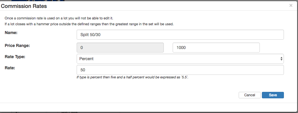 Commission rates can be assigned to a seller or to an individual lot, and can be done at any time before, during or after an auction (keep in mind that changing the commission rate on a lot for an auction that has been settled can create discrepancies between K-BID's auction record and your external records).