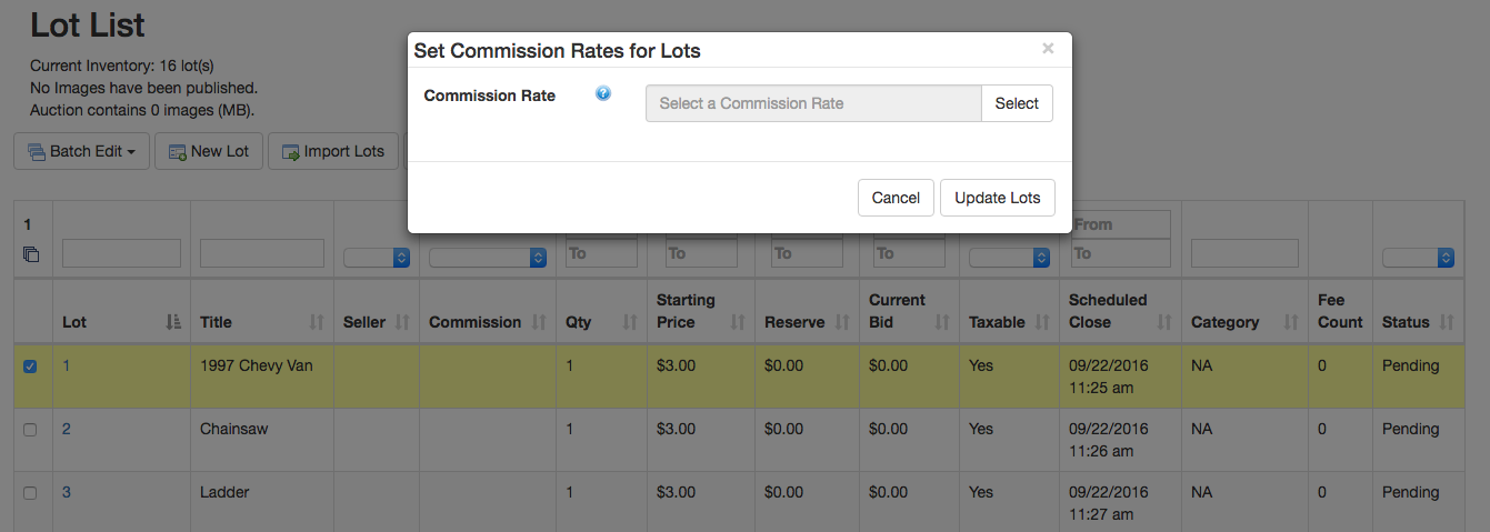 To assign a commission rate to one or more specific lots, select the checkmark next to the lot number(s) and use Batch Edit > Commission Rate. This will override any default commission associated with a particular seller.
