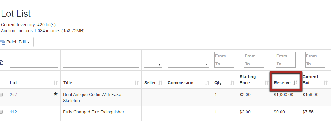 - The Lot List within an auction will display the Reserve and Current Bid prices.