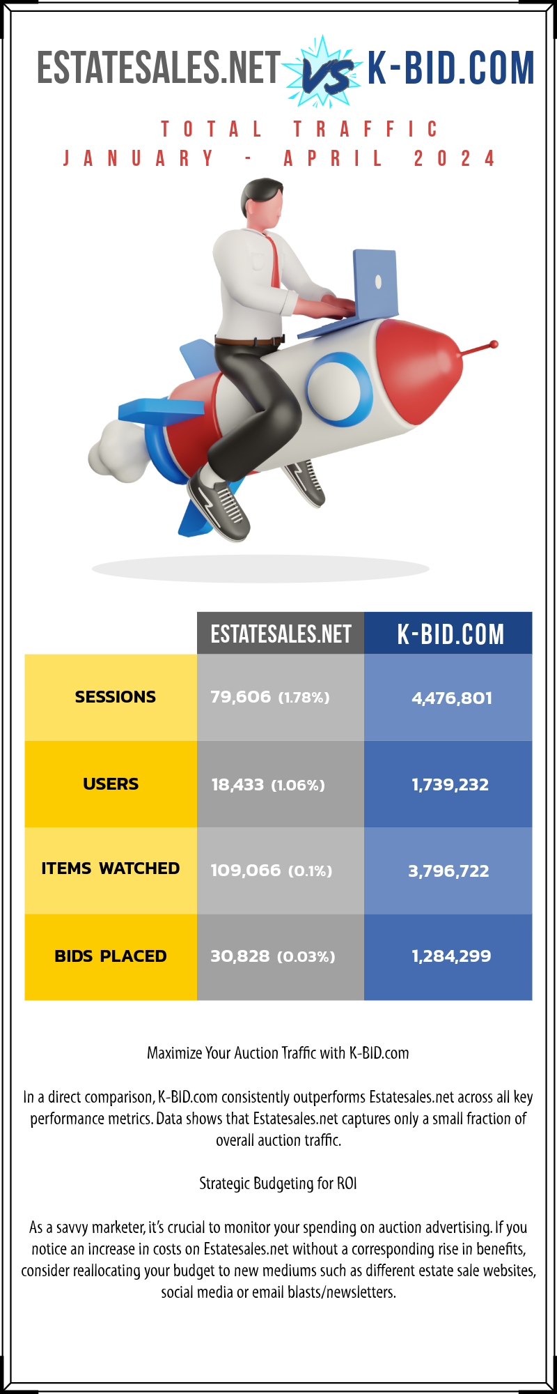 With the upcoming price changes for outbound clicks on EstateSales.net, we wanted to provide you with some traffic numbers from K-BID compared to EstateSales...