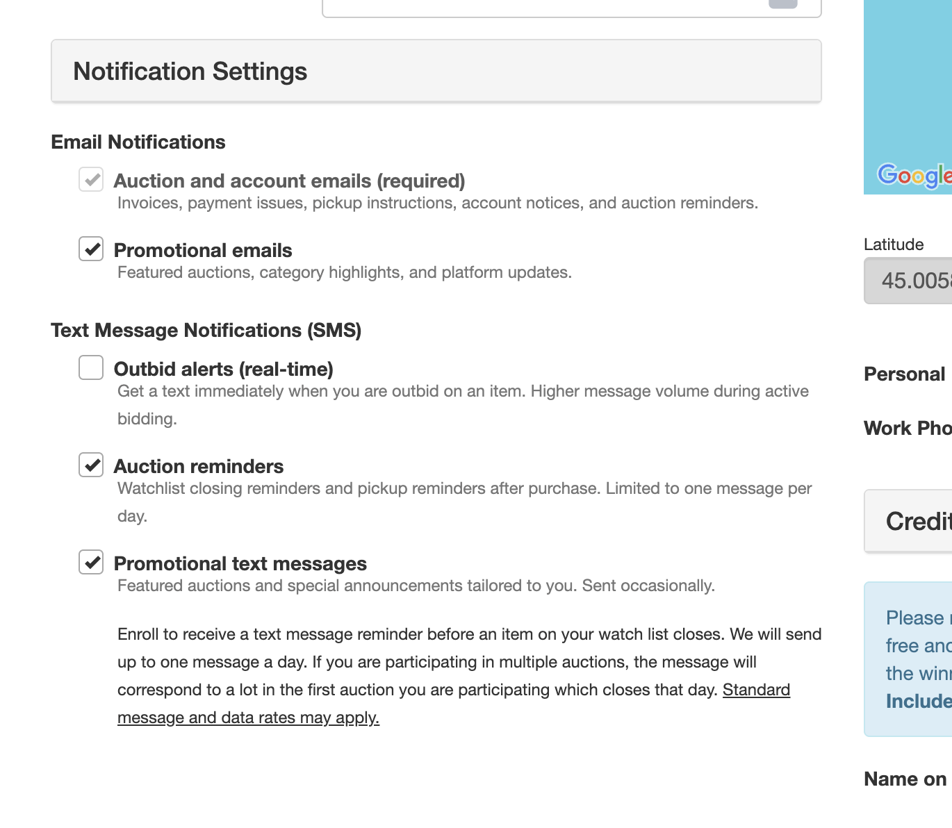 Bidders can now opt in to receive outbid notifications by text message directly from their account page. These follow the same rules as email notifications and stop once the auction begins closing.